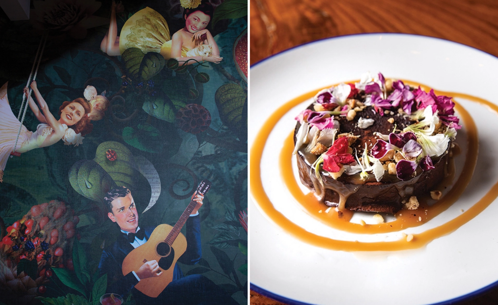 The partners kept Fox & Falcon updates like white-washed brick columns and wood beams that brightened the previously dim dining room. They made the space their own with new framed art, murals and design details like a daring red-velvet wallpaper.